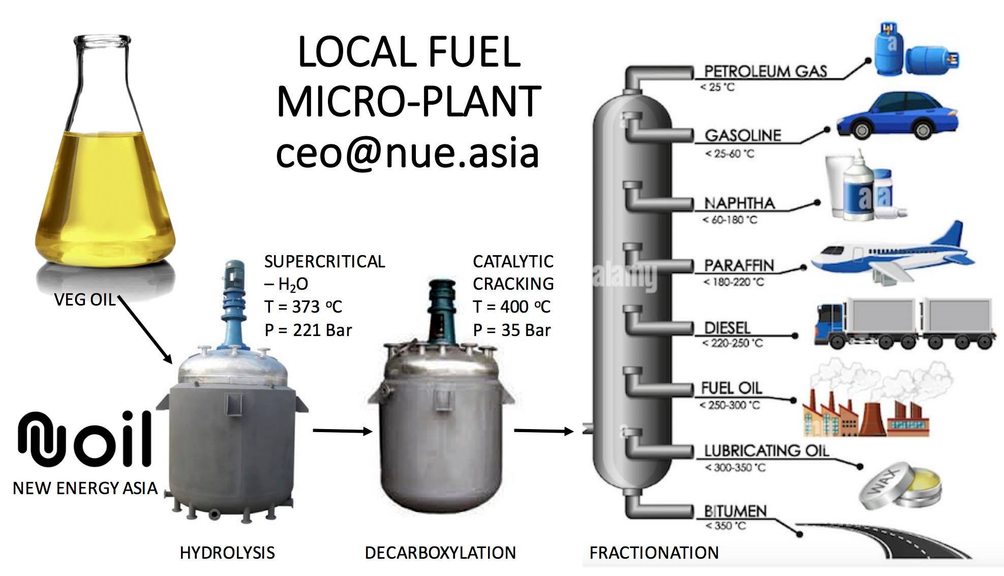 Hasil reaktor kedua akan berupa hydrocarbon dengan berbagai ukuran, yang bisa dipisah-pisahkan dengan fractional distillation. Jadi apapun kebutuhan bahan bakar daerah Anda, bisa diproduksi dengan cara ini.