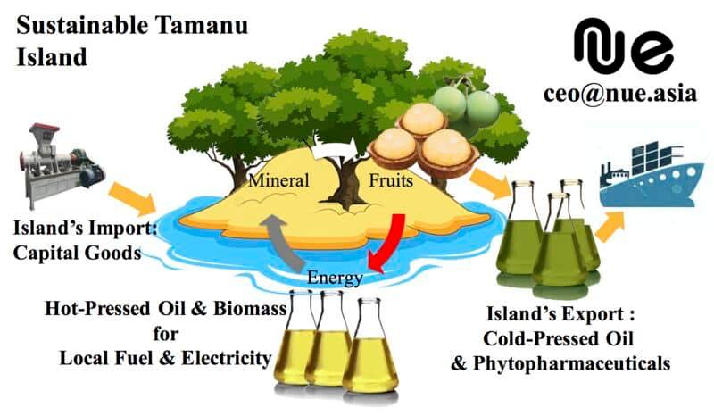 Jadi bagaimana pulau kecil bisa mandiri ekonomi dengan tamanu ini? Biomasa dari cangkang tamanu untuk listrik, minyak hot-pressed untuk BBM setempat (local fuel), sedangkan minyak cold-pressed dan produk phytopharmaceuticals-nya menjadi ‘export’ andalan ke luar pulau. Produk-produk ini bernilai tinggi, jadi feasible bila toh harus diangkut dengan biaya transportasi yang mahal sekalipun.