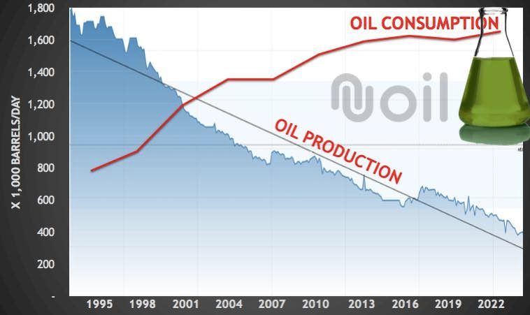Yang lebih serius sebenarnya potensi hilangnya BBM dari minyak bumi di negeri ini. Grafik di bawah sangat clear menjelaskan ancaman masalah ini. Seperempat abad terakhir produksi minyak bumi kita turus turun, sementara kebutuhan terus nsik. Gap antara kebutuhan dan produksi itu saat ini sudah mendekati 1 juta barrel per hari.