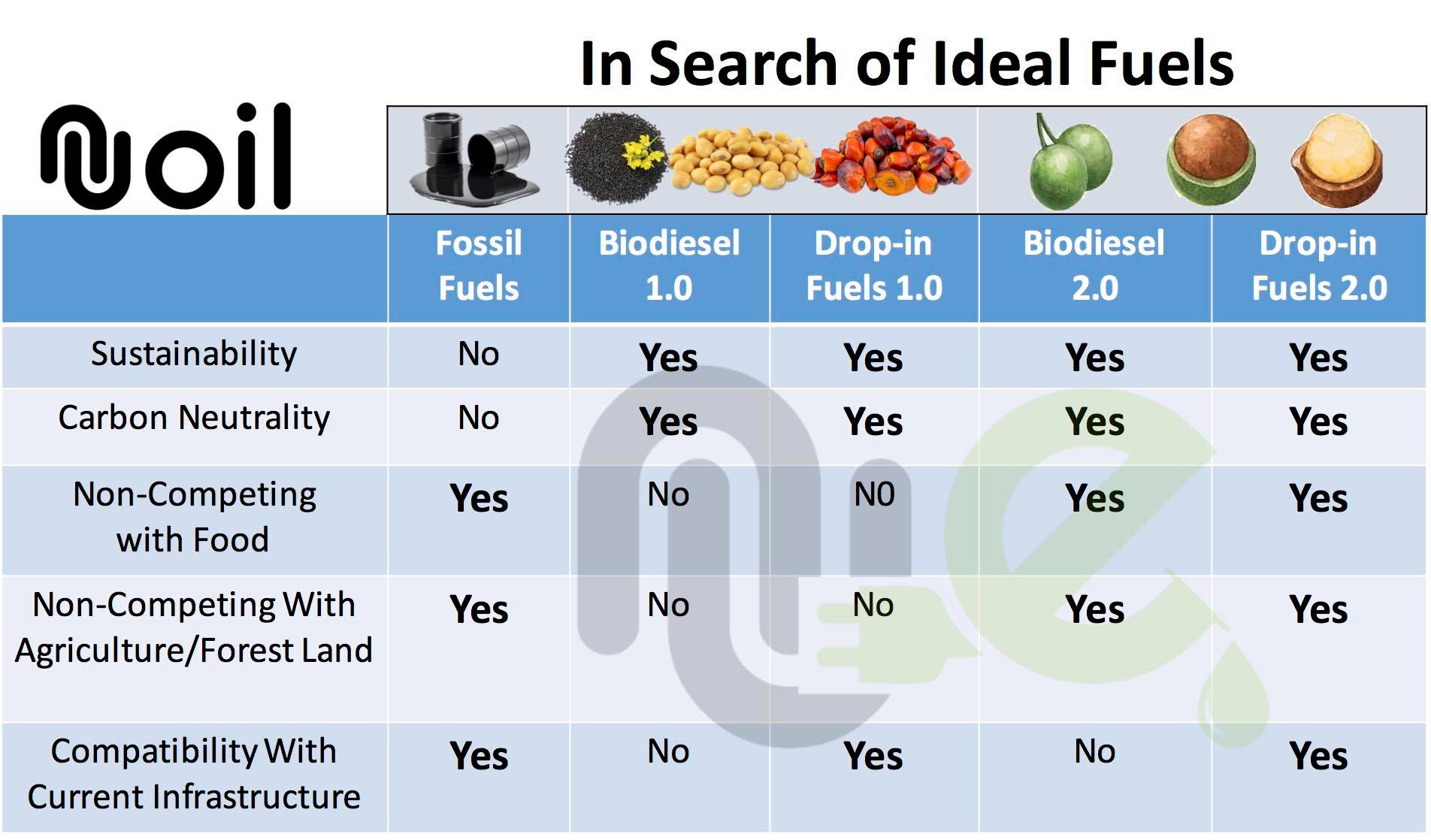 Namun ada satu jenis biofuel baru yang bisa memenuhi kriteria ke lima yaitu yang disebut drop-in biofuels. Bila drop-in biofuels ini diproduksi dari hasil pertanian non-pangan, dan bisa ditanam di lahan gersang apalagi gurun - yang otomatis tidak berebut dengan lahan pertanian maupun hutan, maka dia menjadi bahan bakar ideal yang lolos semua kriteria tersebut di atas. Salah satu contohnya adalah yang saya sebut Nu Oil, biofuel dari minyak biji tamanu.