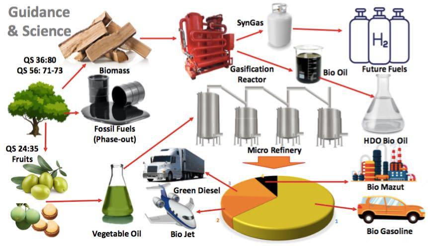 Maka petunjuk Ilahiah itu begitu penting dan relevan, di QS 36:80 diisyaratkan kita tidak perlu menunggu biomasa menjadi fosil, karena kayu yang masih hijau-pun bisa langsung menjadi energi. Salah satu teknologinya bahkan sudah kami kembangkan, yaitu reaktor gasifikasi yang bisa diberi umpan kayu basah sekalipun. Produknya berupa syngas dan panas yang bisa jadi listrik langsung atau bisa juga dengan membrane separation dijadikan Hydrogen yaitu bahan bakar masa depan yang super bersih.