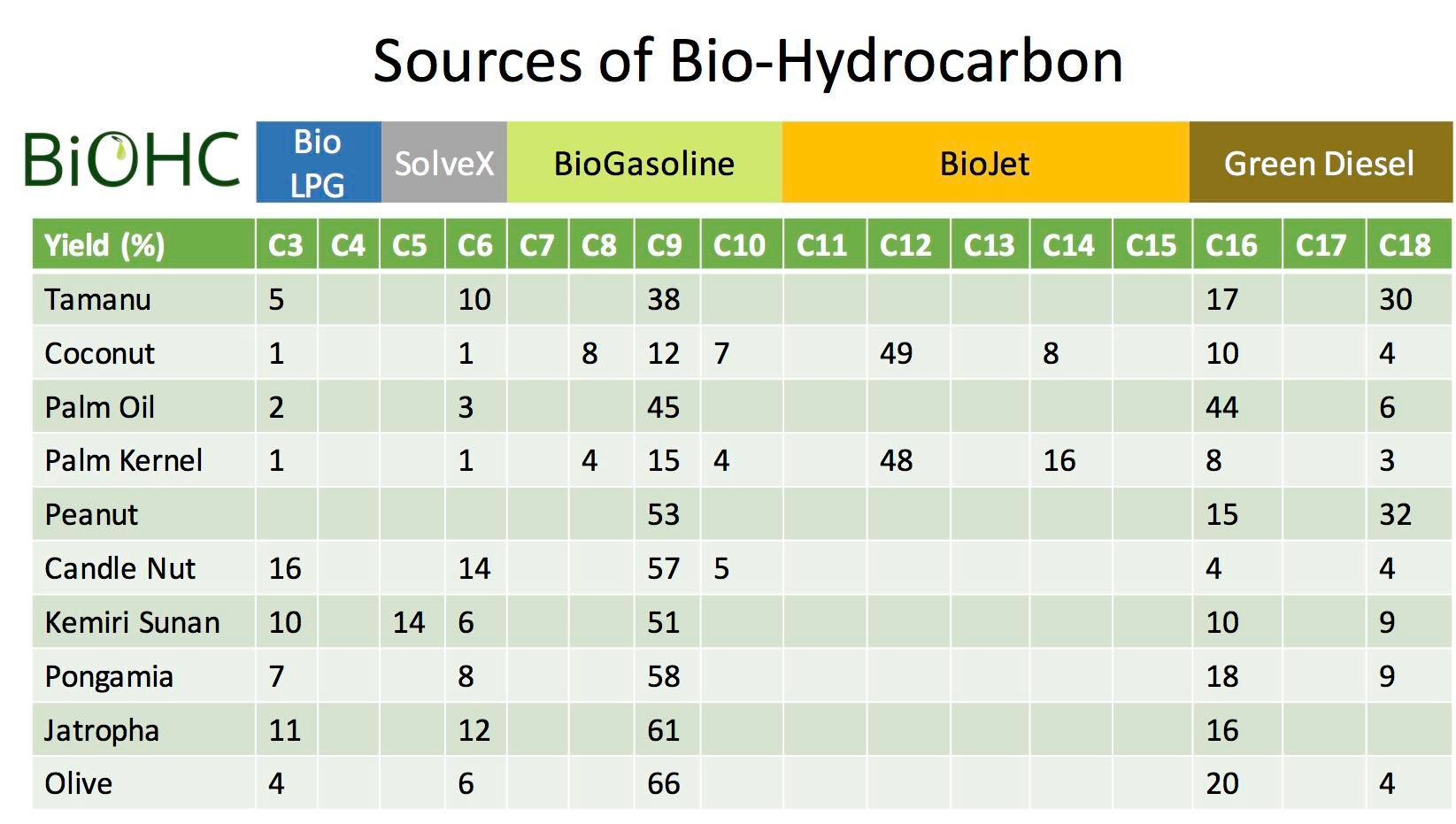 Di bawah adalah tabel sejumlah minyak nabati yang bisa diolah untuk menghasilkab Bio-Hydrocarbon dengan mesin TCat - Thermo Catalytic yang kami design. Apapun Hydrocarbon yang Anda butuhkan saat ini, insyaAllah mayoritasnya bisa diproduksi versi Bio-nya. Bukan hanya untuk pengganti bahan bakar seperti bensin, diesel, avtur sampai LPG, tetapi juga bahan yang dibutuhkan industri seperti solvent dlsb.