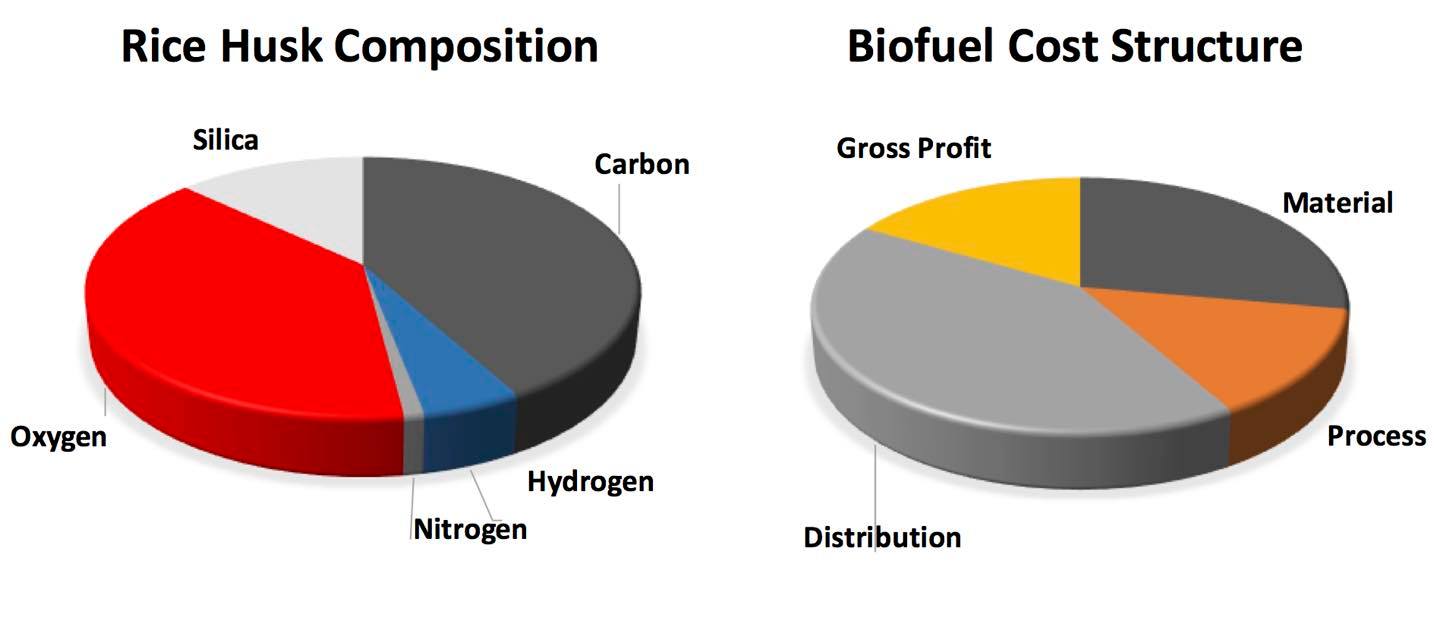 Di tingkat penggilingan padi harga sekam hanya Rp300/kg, katakanlah butuh pengangkutan dlsb. dengan biaya yang sama, maka hanya Rp600/kg. Dengan kandungan HC tersebut di atas, hanya butuh 4 kg sekam utk produksi 1 liter Bahan Bakar, artinya biaya bahan baku hanya Rp 2,400/liter. Bila ditambah biaya proses, logistik dan keuntungan bagi yang mengusahakannya menjadi total 4 kalinya sekalipun, harga bahan bakar bersih berbasis sekam ini hanya Rp 9,600/liter. Jauh lebih rendah dari BBM fosil yang konon harga keekonomiannya sekarang di angka Rp 16,000/liter.