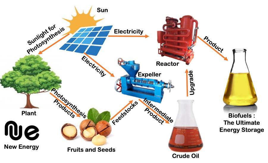 Biofueels inilah penyimpan energi yang paling fleksibel, bisa digunakan kapan saja dan dimana saja, bisa untuk mesin apa saja baik untuk transportasi maupun untuk menghasilkan listrik kembali. Dan menariknya lagi system yang sama tidak hanya bisa mengolah tanaman yang menghasilkan minyak, intinya biomasa apapun bisa diolah dengan system yang sama ini dengan sedikit modifikasi.