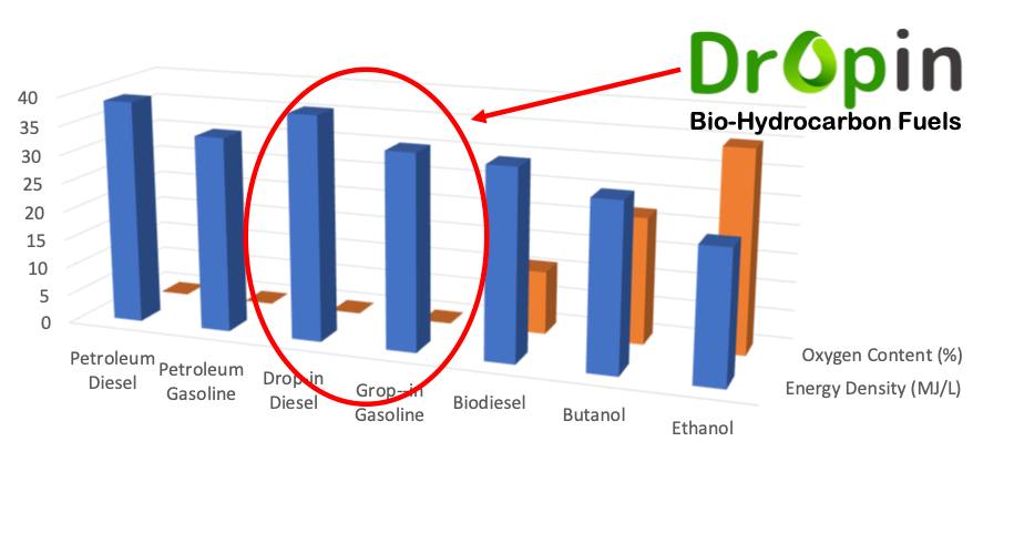 Kandungan energinya sama dengan bahan bakar minyak yang kita kenal seperti solar dan bensin, juga sama-sama tidak mengandung oksigen sehingga tidak korosif dan langsung dapat diemplungkan (makna drop-in) ke kendaraan/mesin transportasi, infrastruktur pengangkutan dan penyimpanan yang ada.