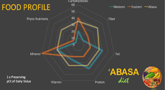 Hasilnya dapat dilihat di grafik radar di bawah. Apa kesimpulannya? Makanan orang timur kuat di karbohidrat dan mineral, makanan orang barat kuat di protein dan lemak. Namun keduanya ternyata lemah di kandungan serat dan fitonutrisi.