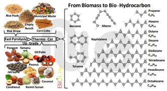 Bedanya untuk buomassa, akan perlu dua tahap proses. Pertama konversi biomassa menjadi bio-oil yang isi utamanya oxygenates (ada di unggahan saya sebelumnya), dan kedua up-grade bio-oil menjadi bio-hydrocarbon. Bio-Hydrocarbon inilah building-blocks seluruh jenis Bahan Bakar yang kita gunakan selama ini.